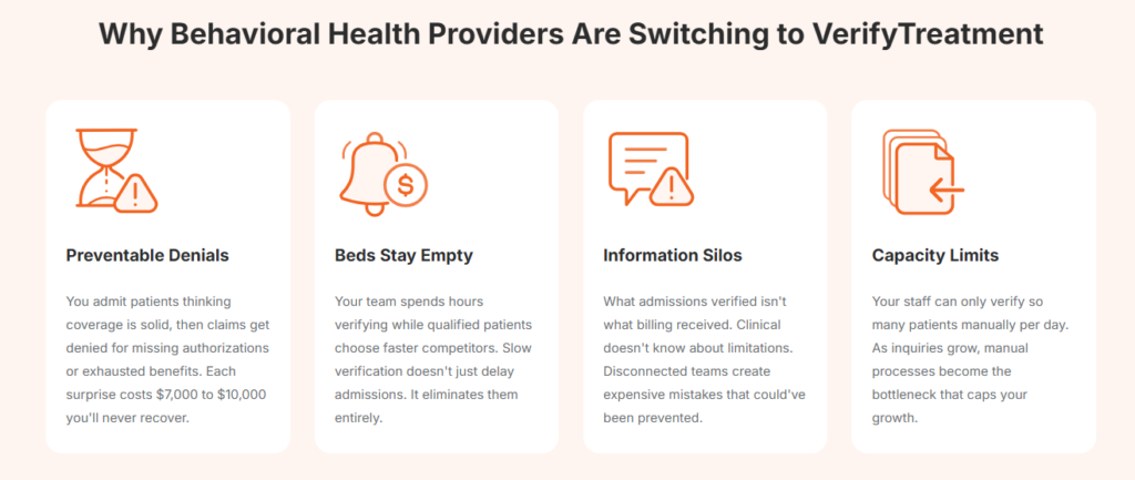 VerifyTreatment focuses on giving admissions teams clearer insurance answers earlier in the process, when decisions are being made, and expectations are set.