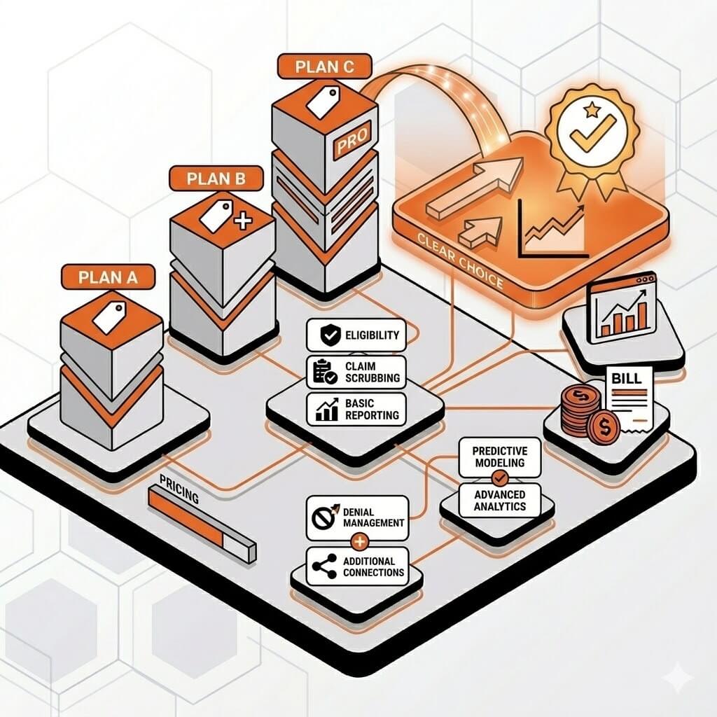 The catch is that “free” only applies to participating payers. As soon as you need access to non-sponsored plans, higher transaction volumes, or added tools, costs can begin to grow. Paid tiers expand payer access and functionality, and each additional service, user, or transaction can increase your total spend.
