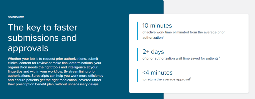 | Surescripts ePA | ePA (pharmacy) | Electronic PA, dynamic question sets, PBM connectivity, EHR integrations | Free portal for prescribers (integration fees vary) | Clinics needing faster medication PAs |