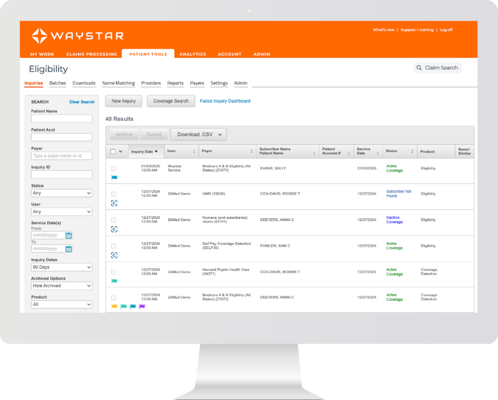 Waystar offers automated eligibility checks and a tool that finds active insurance coverage without manual searches. It connects to many payers and can identify primary or secondary policies even when you only have limited patient details. When new information is added, Waystar runs another check and updates the record so teams always see current coverage.